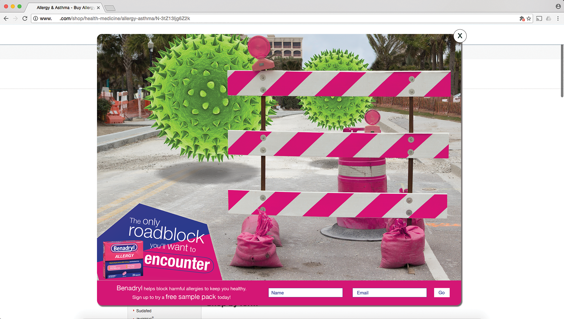 Objective: Design an advertising campaign to promote the sale of a commonly used drugstore product Solution: I decided to emphasize how big a problem allergies are for some people by exaggerating the size of a pollen particle that is being blocked by a Benadryl-enhanced roadblock.