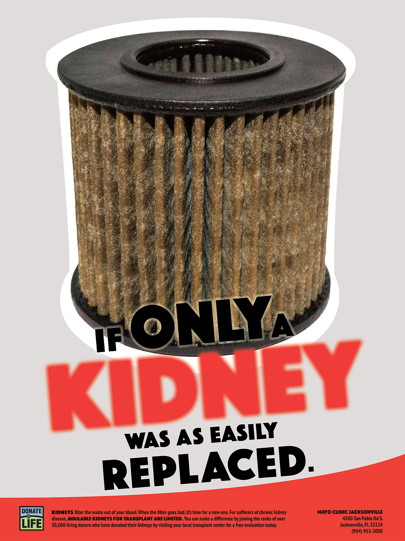 Objective: Create an advertising campaign to promote live kidney donation to those who suffer from Chronic Kidney Disease Solution: I created a 3-part poster series emphasizing cut-out filters that are taken for granted in everyday life. I took these objects and displayed them in a dirty, used way to show that they need to be replaced to continue serving their purpose. In order to improve quality of life and life expectancy, a live kidney donation is the best choice compared to dialysis or a donation from a deceased donor.